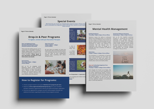 I collaborate with Open Door Group’s Thrive and Project EveryBODY teams to promote mental health and inclusion in the community. I created a daily journal illustrated with my own drawings, designed the Thrive calendar to showcase activities that connect people, and crafted event materials such as the sponsorship package for Project EveryBODY’s annual Artshow.